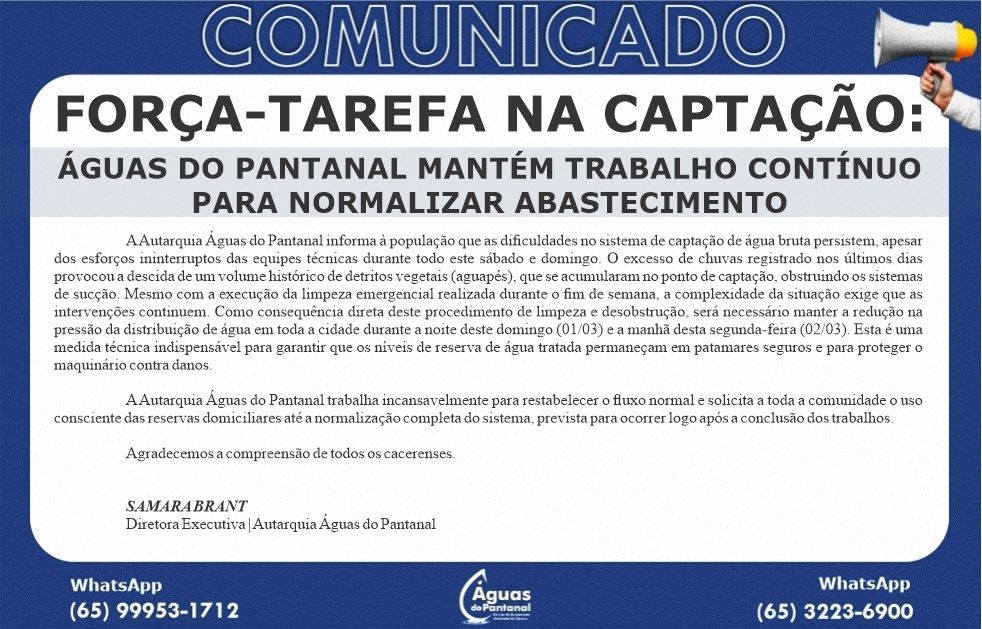 A Autarquia Águas do Pantanal informa à população que as dificuldades no sistema de captação de água bruta persistem, apesar dos esforços ininterruptos das equipes técnicas durante todo este sábado…
